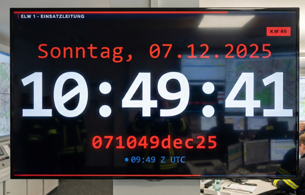 Wenn jede Sekunde zählt: Unsere Taktischen Uhrensysteme verwandeln jeden Monitor in eine hochverfügbare, digitale Einsatzzentrale für BOS & Katastrophenschutz.