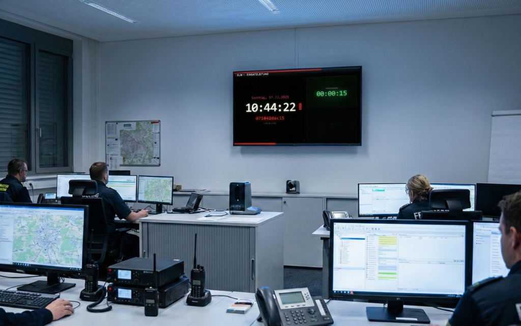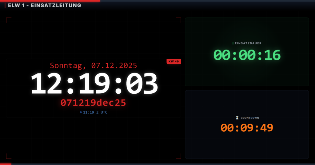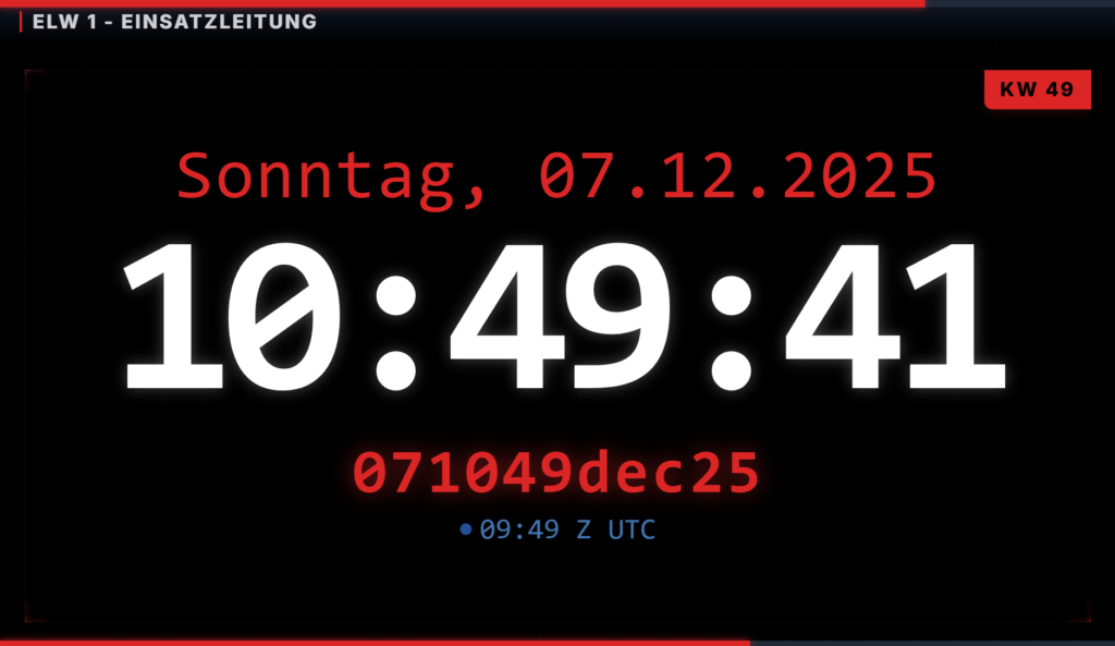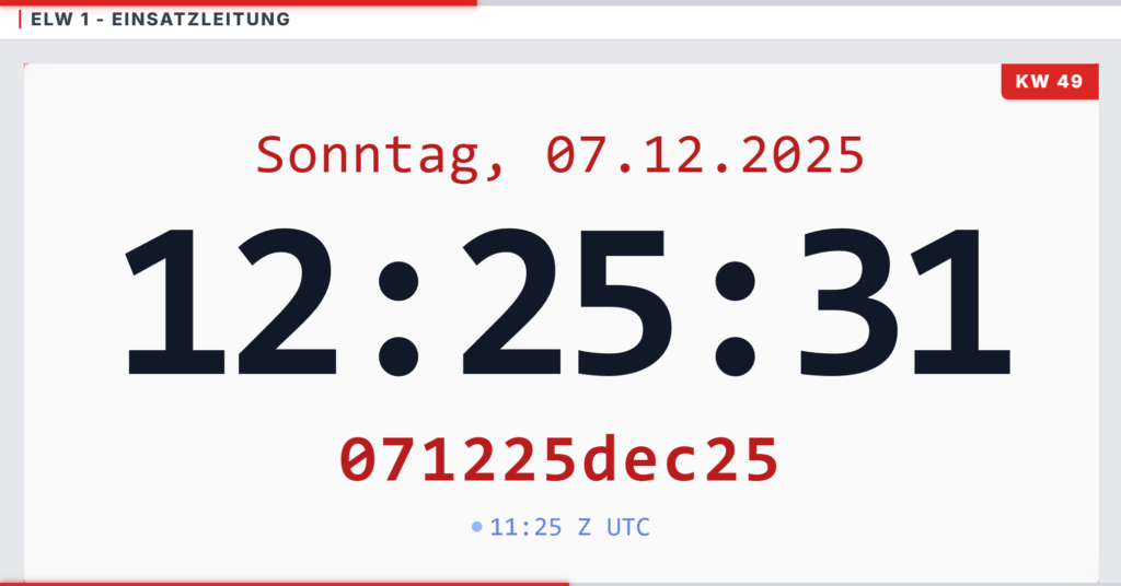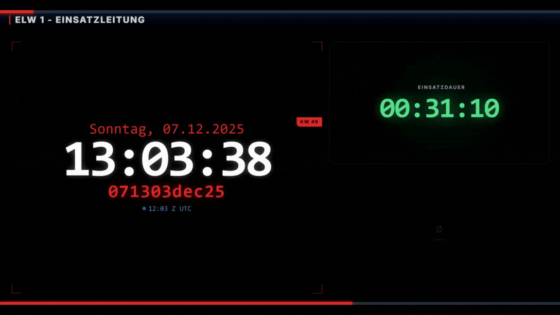 In der Chaosphase eines Großeinsatzes ist die Zeit ein wichtiger Anker für Dokumentation und Lageführung. Doch herkömmliche Wanduhren sind oft ungenau, schwer ablesbar; Industrie-LED-Zeilen häufig unflexibel in der Konfiguration.